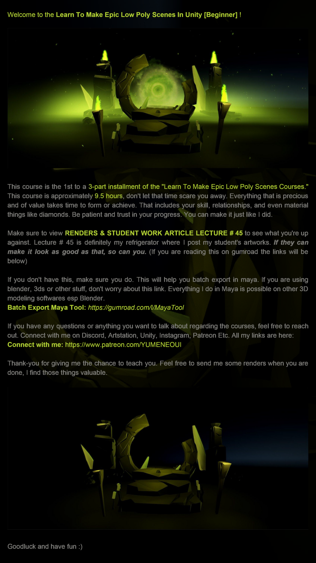 If you have any questions or anything you want to talk about regarding the courses, feel free to reach out. Connect with me on Discord, Youtube, Patreon, Artstation, Unity, Instagram Etc. All the links, tutorial playlist and everything you will need will be on Patreon: